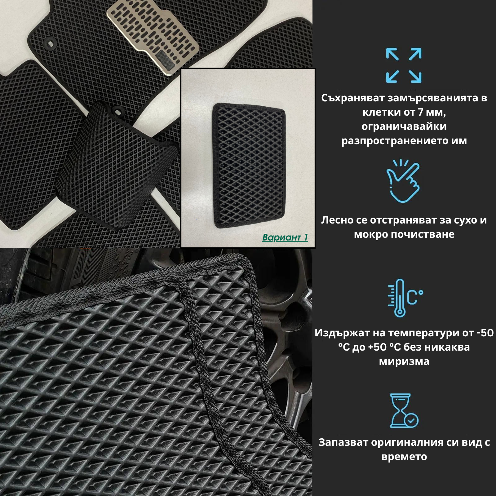 Специалната структура задържа мръсотията и влагата, без да пропуска неприятни миризми или течности към пода на автомобила.